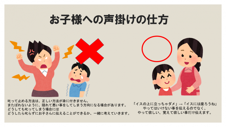 今回はお子様への褒め方や注意の仕方など、言葉かけについてとなります。